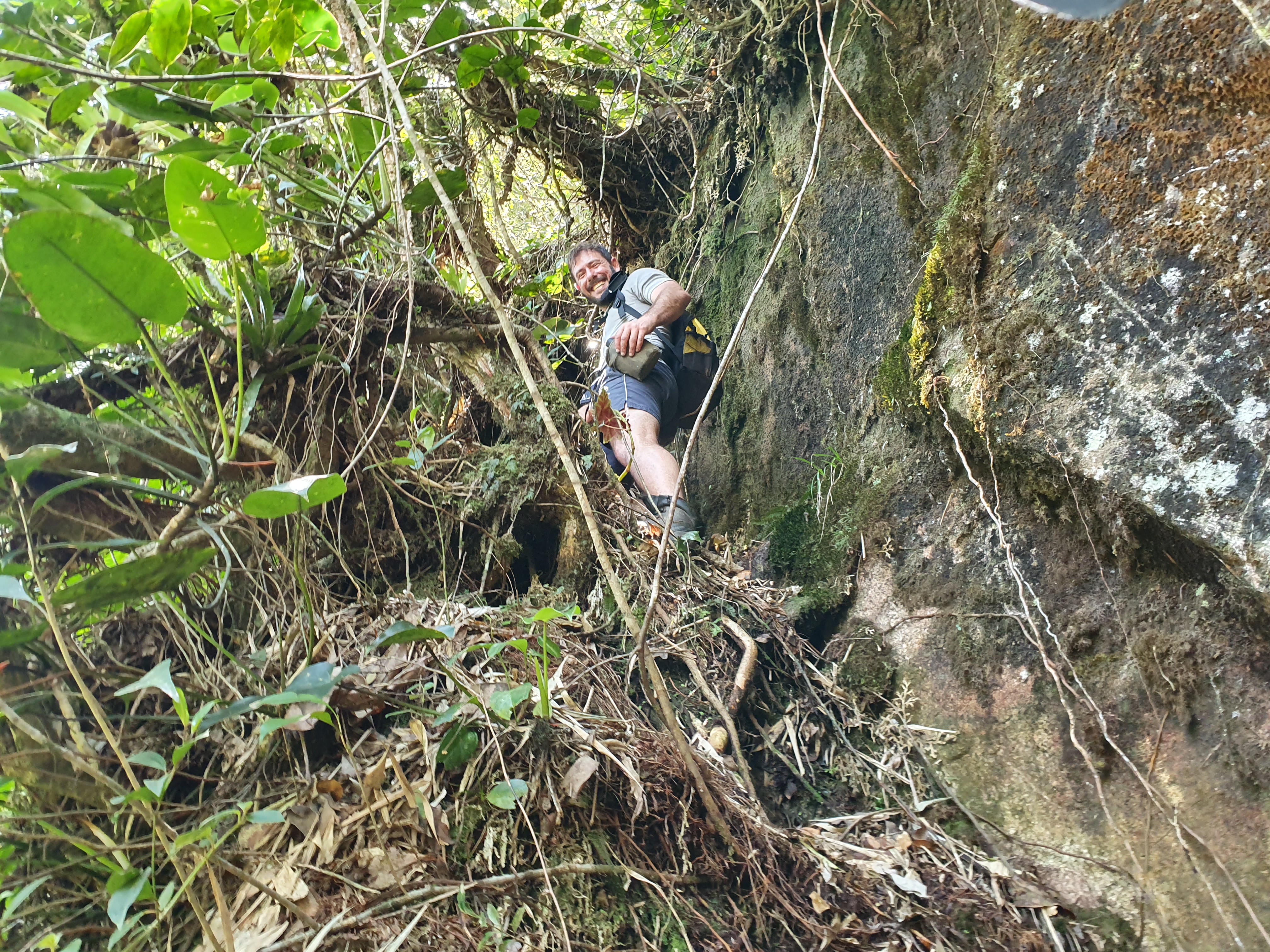 Eu ainda não tinha feito o cume do Araponga, mas já sabia que a pernada não seria passeio não. O André foi um dos que abriu essa trilha, então sobrou para ele puxar a frente da caminhada. A trilha não estava muito batida, tivemos vários pontos de dúvida para onde seguir. Chegando bem próximo do Araponga o relevo fica bem mais acentuado, alguns trechos parece até uma escalaminhada de tão íngreme que fica a trilha.