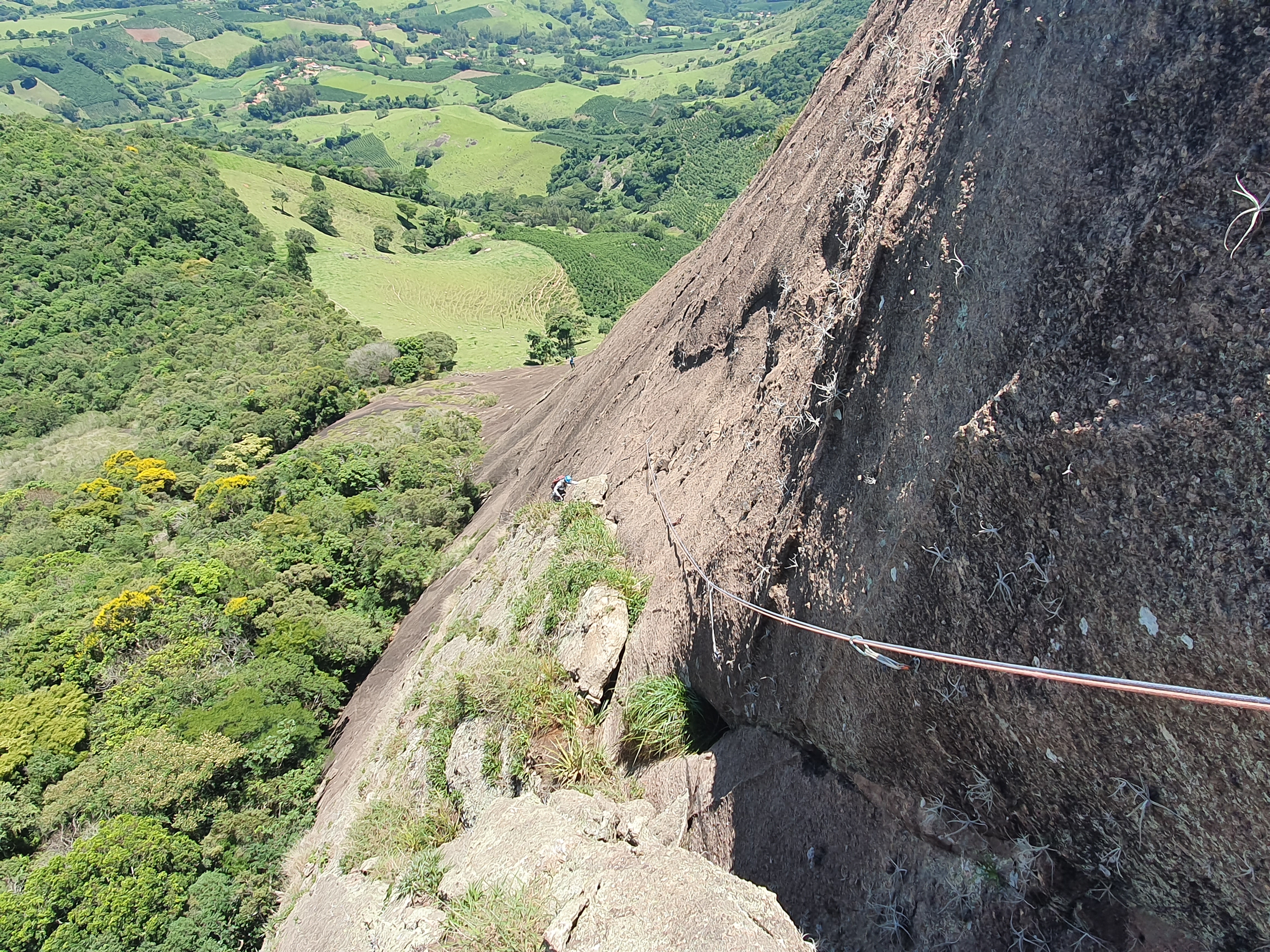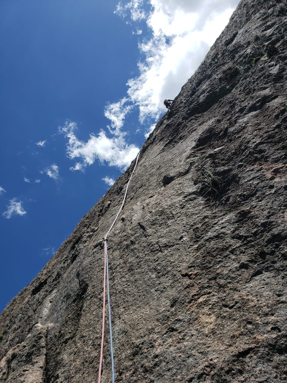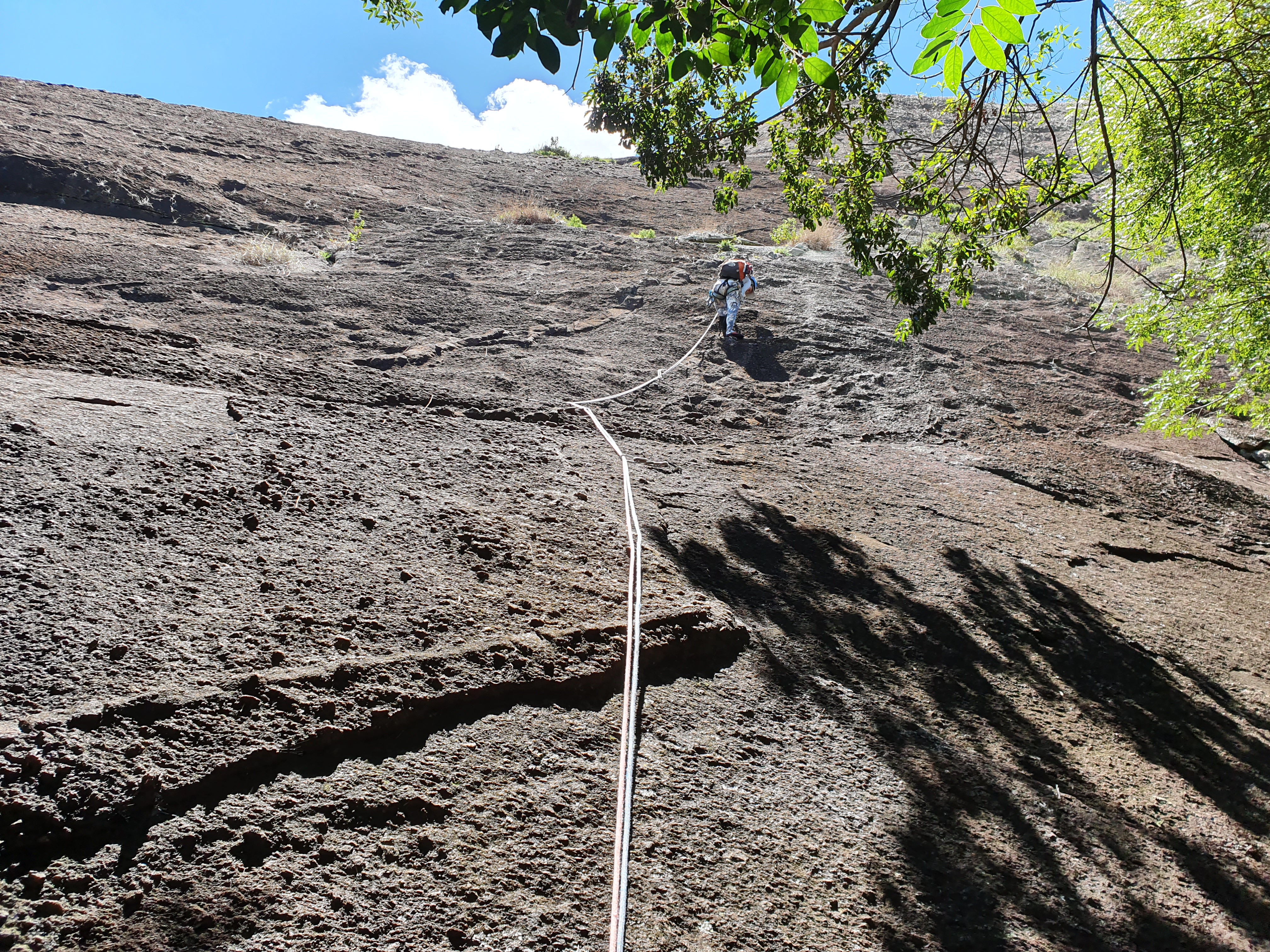 A Michelle puxou a primeira enfiada para relembrar como era estar guiando na parede, que na verdade é a posição mais divertida. Lances de aderência foi o que mandou nesses primeiros 30 metros de escalada. A segunda enfiada bem diferente que a anterior, mas bem tranquila tecnicamente, uma fenda meio que chaminé com proteções fixas até a P2 sem apresentar nenhum problema. A próxima foi a enfiada mais divertida, mais exigente com lances bem bonitos deram uma apimentada na escalada e os últimos metros até o final da via com muitas agarras e com uma orientação bem tranquila. Da P4 é só subir caminhando até o cume e aproveitar o visual.