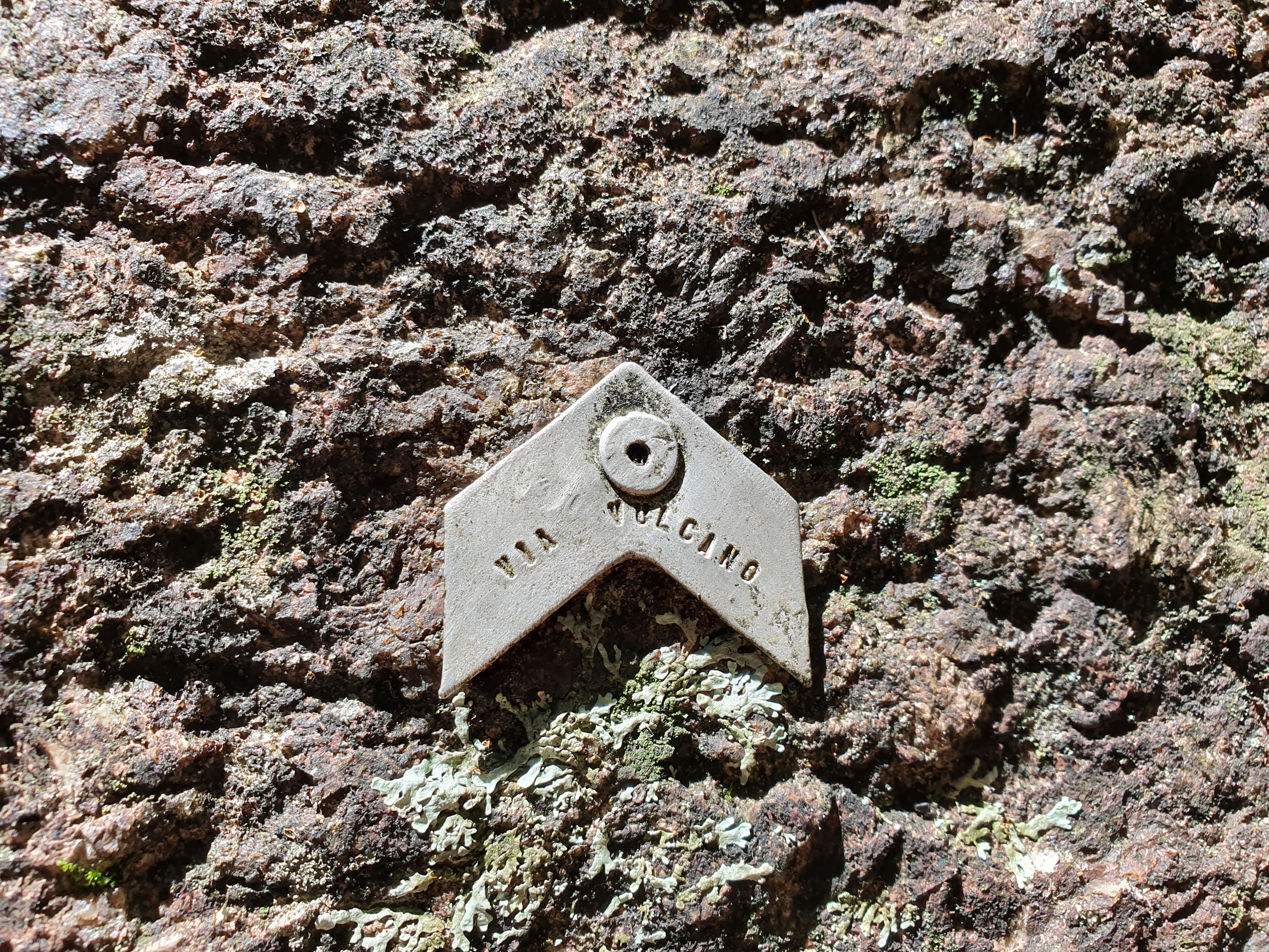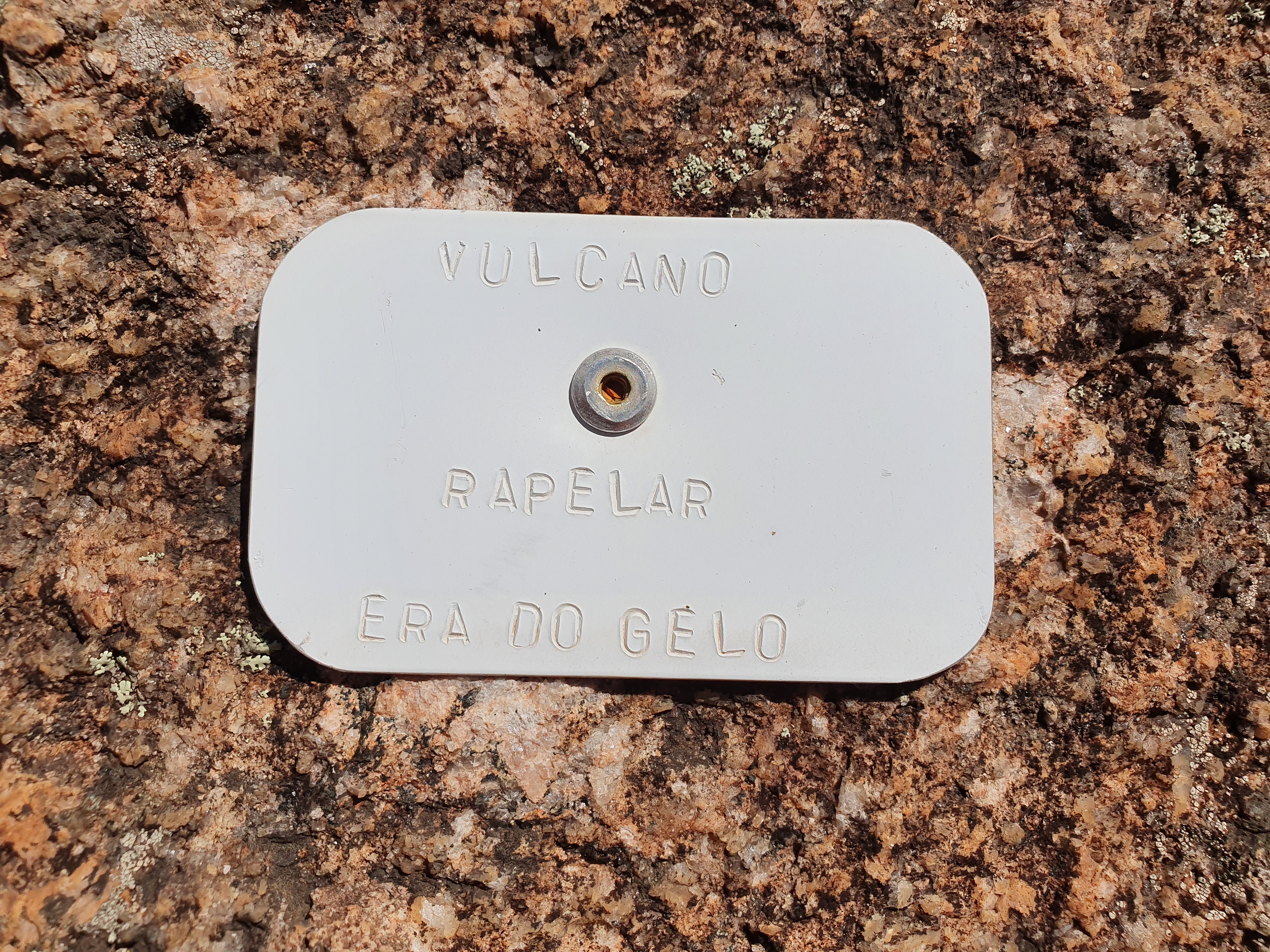 Chegando próximo a parede seguimos as orientações do croqui para achar a base da via, nos batemos um pouco, mas logo achamos o início da via. Só quando cheguei bem próximo a parede notei que tinha uma plaquinha de ferro grudada na rocha com o nome da via, não tinha como errar.