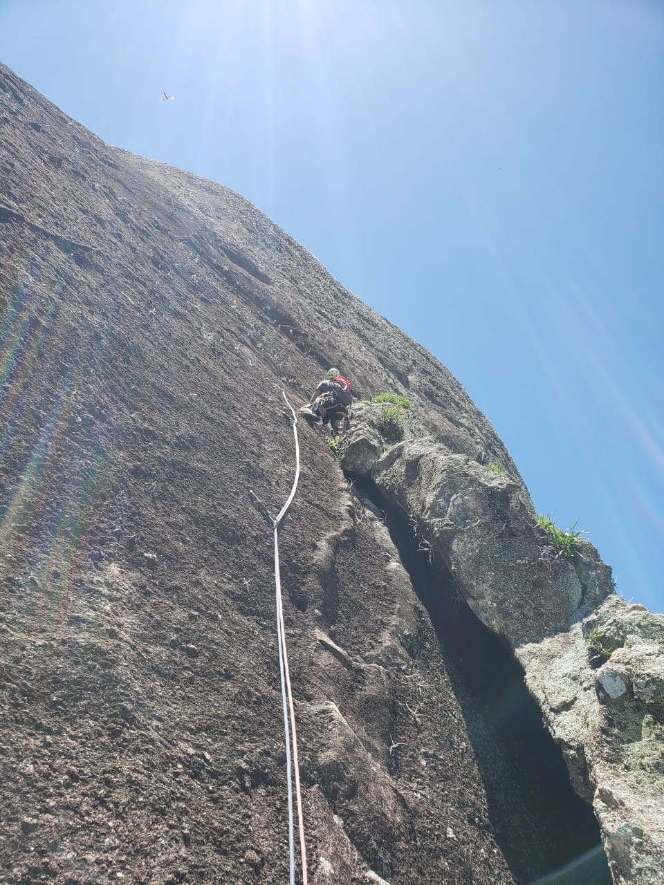 Depois de um breve lanche no cume e algumas fotos fomos atrás do rapel. A linha de descida era pela via “Era do Gelo” que fica a esquerda da Vulcano. Na verdade achei meio exposto pra chegar nos grampos de descida dessa via, como vim do cume procurando os grampos ficou meio estranho mas talvez saindo da P4 da Vulcano seja mais tranquilo. Fizemos 3 rapeis de 50 metros até chegar na base novamente.