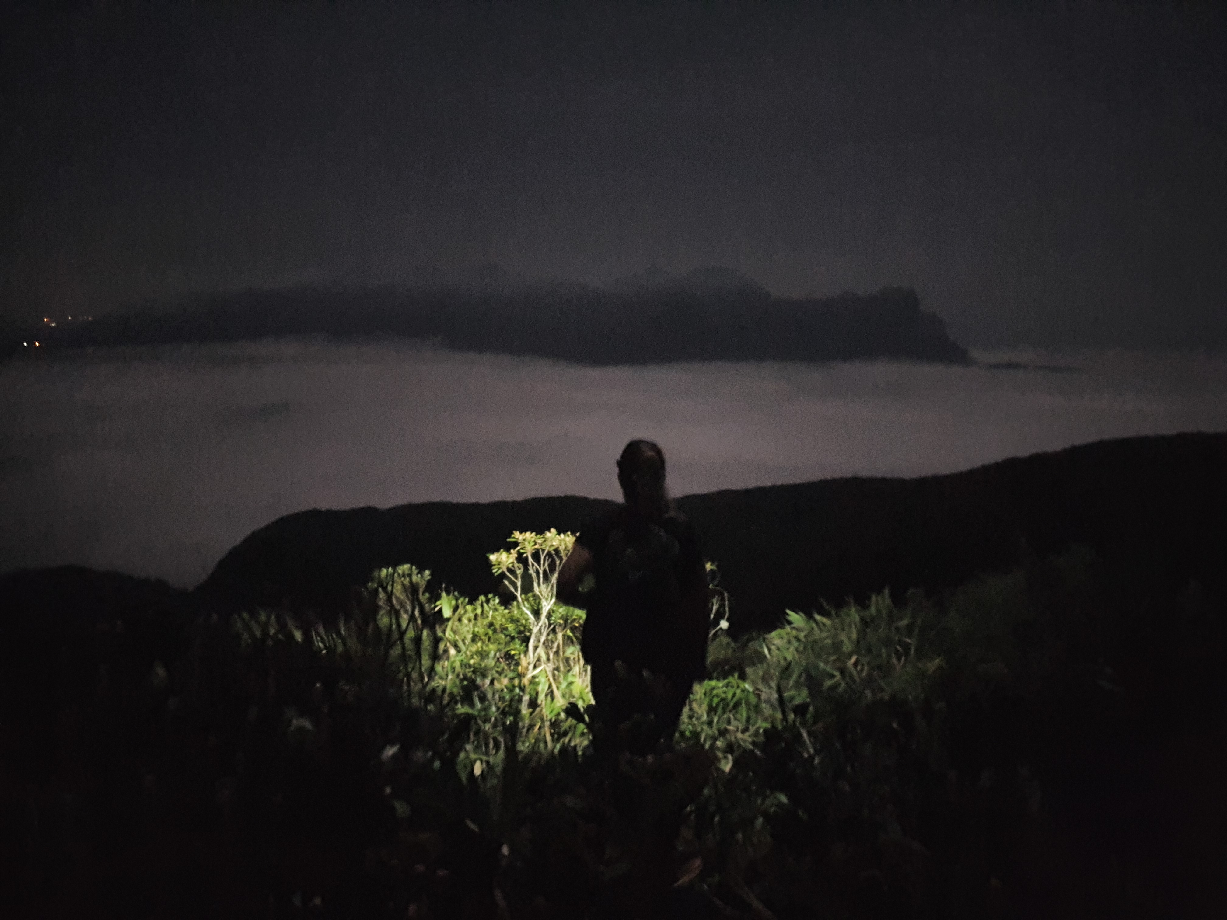 Algumas fotos, dividimos uma maça e já estávamos prontos para voltar. No retorno ao cume do Mãe Catira dava pra ver as luzes da cidade, o calor tinha indo embora, agora só tinha um vento gelado que algumas vezes era quebrado com um bafo quente dando uma sensação de chuva.