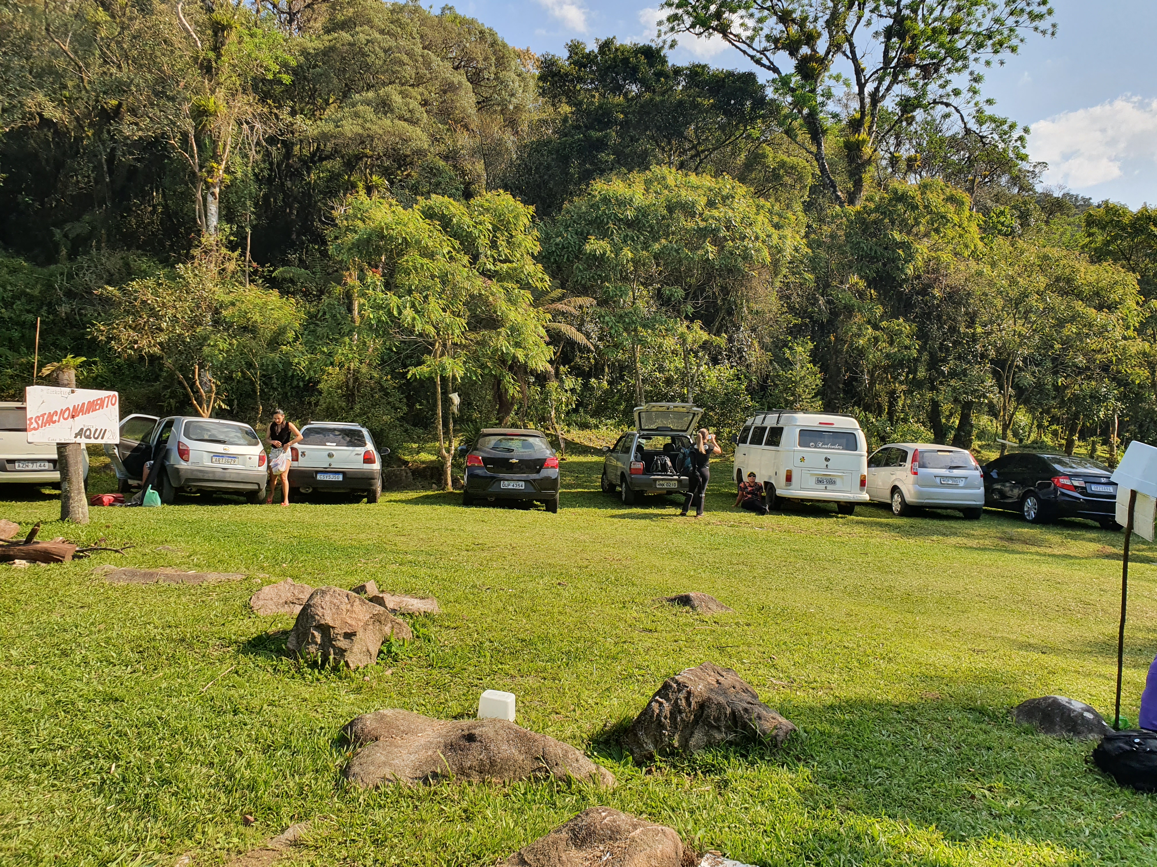 Quando chegamos no estacionamento da Fazenda Gueuber encontramos uma galera descansando na grama depois de um dia de caminhada, pela quantidade de carros dava pra ter ideia que ainda tinha várias pessoas lá para cima.